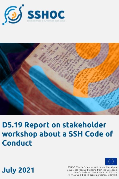 The partners of Task 5.3 (CESSDA/NSD, DARIAH, CESSDA/DNA, and CNR) carried out a digital, three hours Stakeholder Workshop about a Social Science and Humanities Code of Conduct on the 17 March 2021. The workshop was organized as a combination of presentations by speakers followed by questions or comments. The last part of the workshop consisted of a thorough discussions of six prepared questions with 35 participants from the research sector. The discussions in the breakout rooms were moderated by task members.