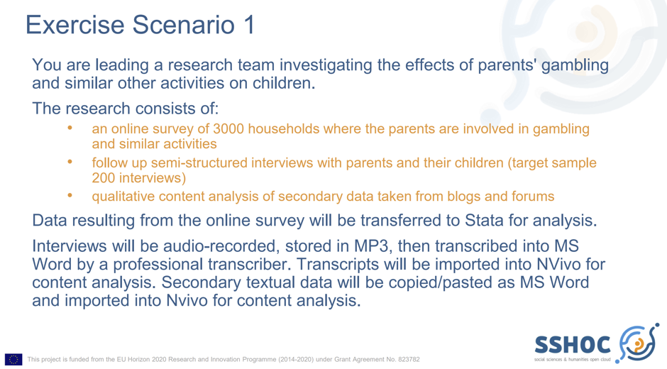 The participants then discussed key issues that should be addressed within a DMP for three research scenarios (see the image below). The discussion revolved around consent for specific types of data, proprietary formats, sharing among research teams and concerns related to sharing.