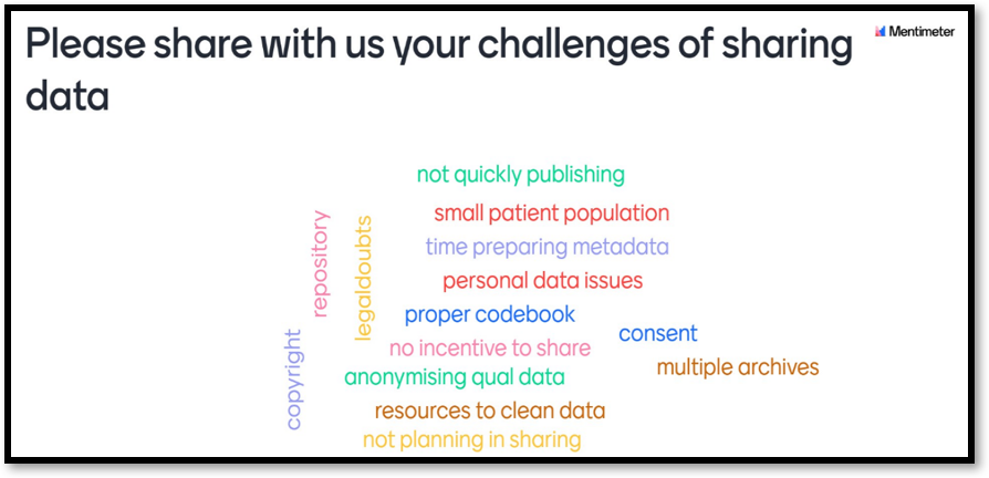 The workshop and day 2 wrapped up with a final presentation from Cristina Magder on the challenges to sharing social science data. The participants were asked to discuss their concerns of data sharing, which, as noted by the speaker, were very similar to the challenges raised in the 2018 Springer Nature Whitepaper: Practical challenges for researchers in data sharing. According to data, most researchers were struggling with organising data in a presentable and useful way (46%), followed by copyright and licensing uncertainties (37%), not knowing which repository to use (33%), lack of time to deposit data (26%) and costs of sharing data (19%).