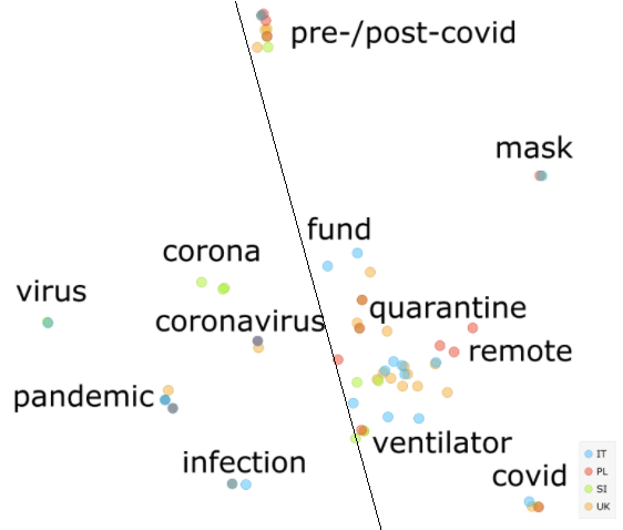 A recent event which had a massive impact across the world is the COVID-19 epidemic. In this research project which was part of the SSHOC workshop during the Helsinki Digital Humanities Hackathon, an interdisciplinary group of six researchers led by Ajda Pretnar and Matej Klemen used transcripts from four parliaments (Italian, Polish, Slovene, and British) to analyse the differences between debates before and during the epidemic. The ParlaMint data set (Erjavec et al. 2021) was used as a data source since it contains parliamentary transcripts, metadata and linguistic annotations of the transcripts for both periods. National corpora were sampled into two subcorpora, the COVID-19 subcorpus and the Reference subcorpus. Both contained only the speeches from regular MPs, thus excluding the parliamentary speakers (chairpersons) and guests. The interdisciplinary team from the fields of humanities, social sciences and computer science first worked together to develop research questions and find appropriate methods. The team then split up according to their language proficiency to analyse the data and collaborated intensively in order to exchange the individual expertise.