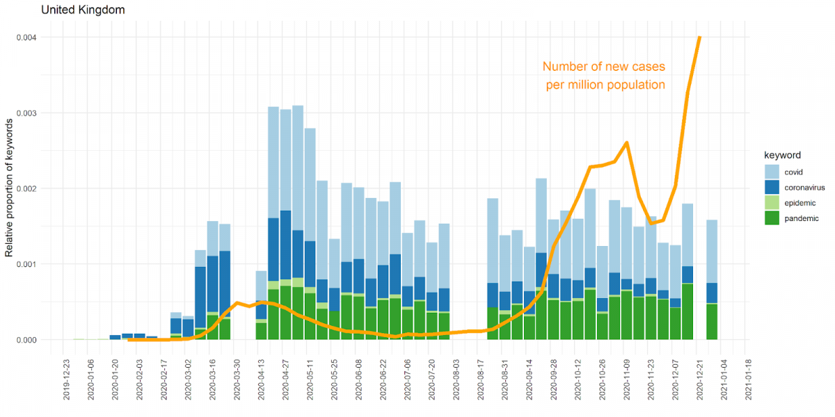 Of the four countries analysed, the first coronavirus cases were found in Italy and in the United Kingdom, on 31 January 2020 (according to data from the Johns Hopkins COVID-19 Data Repository; Dong, Du, and Gardner 2020). In the British parliament, the first mentions of “coronavirus” on 22 January preceded first infections, and mentions of pandemic-related words increased before an uptick in infection numbers. In Italy the first debates of the coronavirus in the parliament coincided with the first surge of infections.