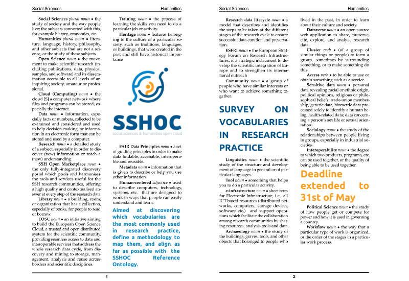 SSHOC is organising a survey, reaching out to all researchers in the Social Sciences and Humanities (SSH), to discover which vocabularies are the most commonly used in SSH research practices, define a methodology to map them, and align as far as possible with the SSHOC Reference Ontology.